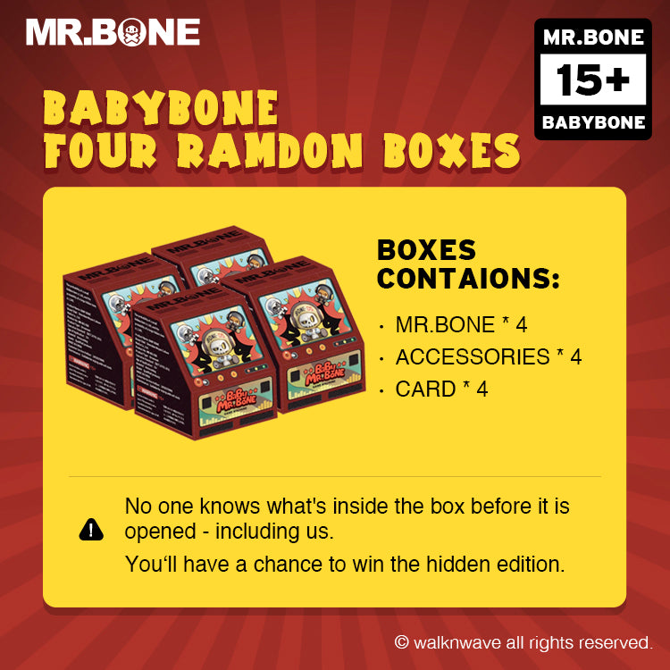 Mr.Bone the BabyBone series includes 22 regular models and 5 small hidden models and 4 big hidden models. If you buy one randomly, you have a chance of winning the hidden model.